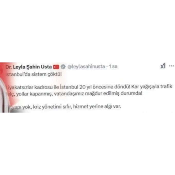 AKP Grup Başkanvekili ve Ankara Milletvekili Leyla Şahin Usta, İstanbul Büyükşehir Belediye Başkanı Ekrem İmamoğlu'nu eleştirmek amacıyla sosyal medya hesabından yaptığı bir paylaşımda, "İstanbul 20 yıl öncesine döndü" ifadelerini kullandı. Ancak bu ifade, 20 yıl önce İstanbul'un AKP'li Kadir Topbaş tarafından yönetildiği döneme atıfta bulunuyordu. Hatasını fark eden Usta, paylaşımını kısa süre içinde sildi.
