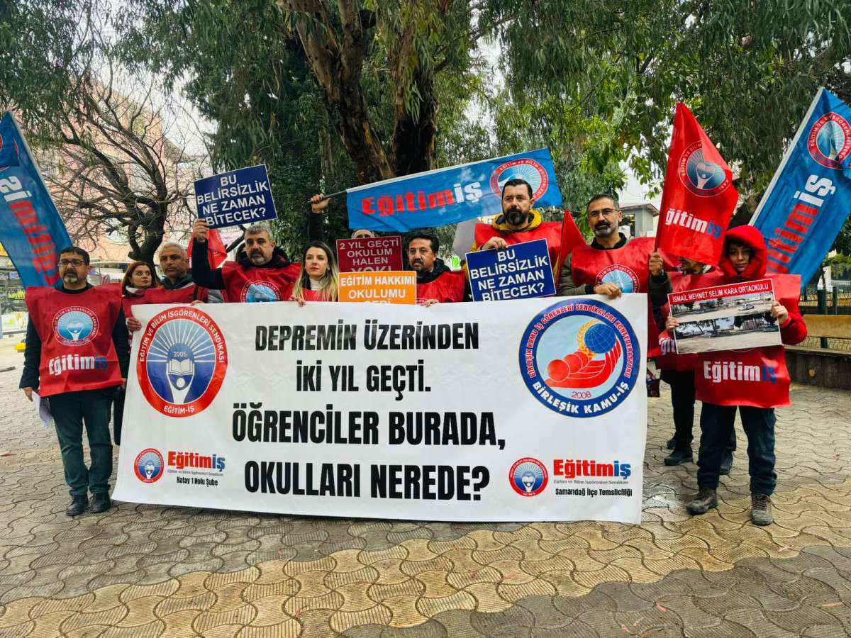 Bu süreçte depremin etkilediği tüm illerde eğitim büyük sorunlar ve zorluklar içinde yürütülmeye çalışılırken, en büyük yıkımın yaşandığı Hatay ilinin Samandağ ilçesinde eğitim sorunların çözümüne dair devlet tarafından adeta hiç önlem alınmamış olması Samandağ’da durumu çok daha ağır ve içinden çıkılamaz hale getirmektedir. Depremde ağır hasar alan ve sonrasında yıkılan okulların yerine yeni okullar yapılmamış, üzerinden 24 ay geçmiş olmasına rağmen birçok okulun tadilatları bile tamamlanmamıştır. Geçen bu süre içinde okullar başka okullarla birleştirilmiş veya konteynerlerde eğitim vermeye devam etmiştir. Bu durum Samandağ’da eğitim kalitesinin düşmesine, bu öğrencilerimizin fırsat eşitsizliği yaşamasına neden olmaktadır. Çünkü okul birleştirmeleri sebebiyle birçok okulda ders süreleri 30 dk.’ya düşürülmüştür. Bu durum eğitimde eşitlik ve tüm öğrencilerimizin nitelikli ve eşit eğitime erişim hakkı ilkesine aykırıdır. Aynı kazanımları alan bu öğrencilerin her ders 10 dk. Her gün en az 1 saat, her hafta 5 saat, her ay 22 saat, bir eğitim öğretim yılında 180 saat öğrenme kaybına neden olmaktadır.