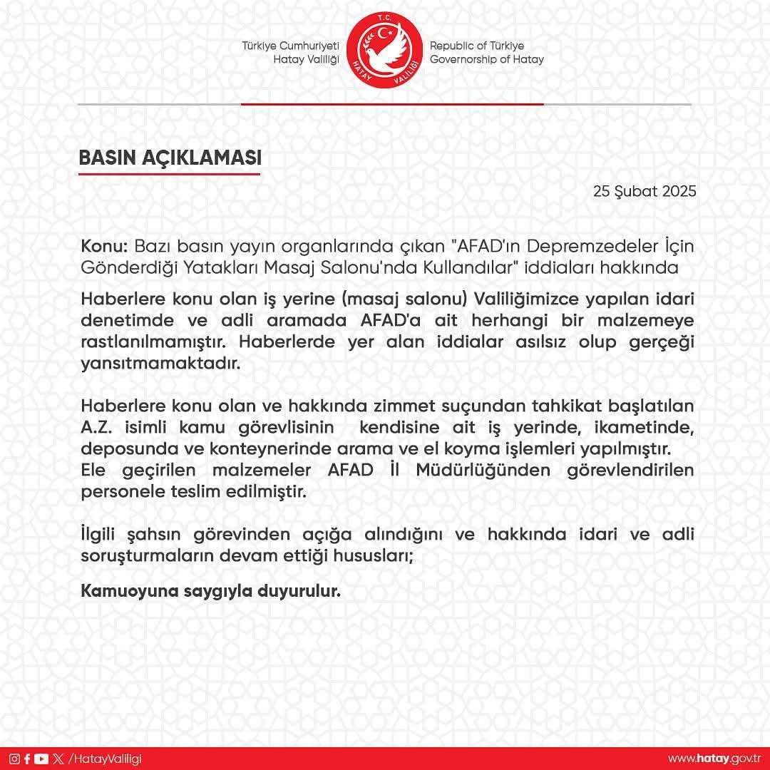 Açıklamada; “Haberlere konu olan iş yerine (masaj salonu) Valiliğimizce yapılan idari denetimde ve adli aramada AFAD'a ait herhangi bir malzemeye rastlanılmamıştır. Haberlerde yer alan iddialar asılsız olup gerçeği yansıtmamaktadır. Haberlere konu olan ve hakkında zimmet sucundan tahkikat başlatılan A.Z. isimli kamu görevlisinin kendisine ait iş yerinde, ikametinde, deposunda ve konteynerinde arama ve el koyma işlemleri yapılmıştır. Ele geçirilen malzemeler AFAD İl Müdürlüğü’nden görevlendirilen personele teslim edilmiştir. İlgili sahsın görevinden açığa alındığını ve hakkında idari ve adli soruşturmaların devam ettiği hususları; basına ve kamuoyuna saygıyla duyurulur” denildi.