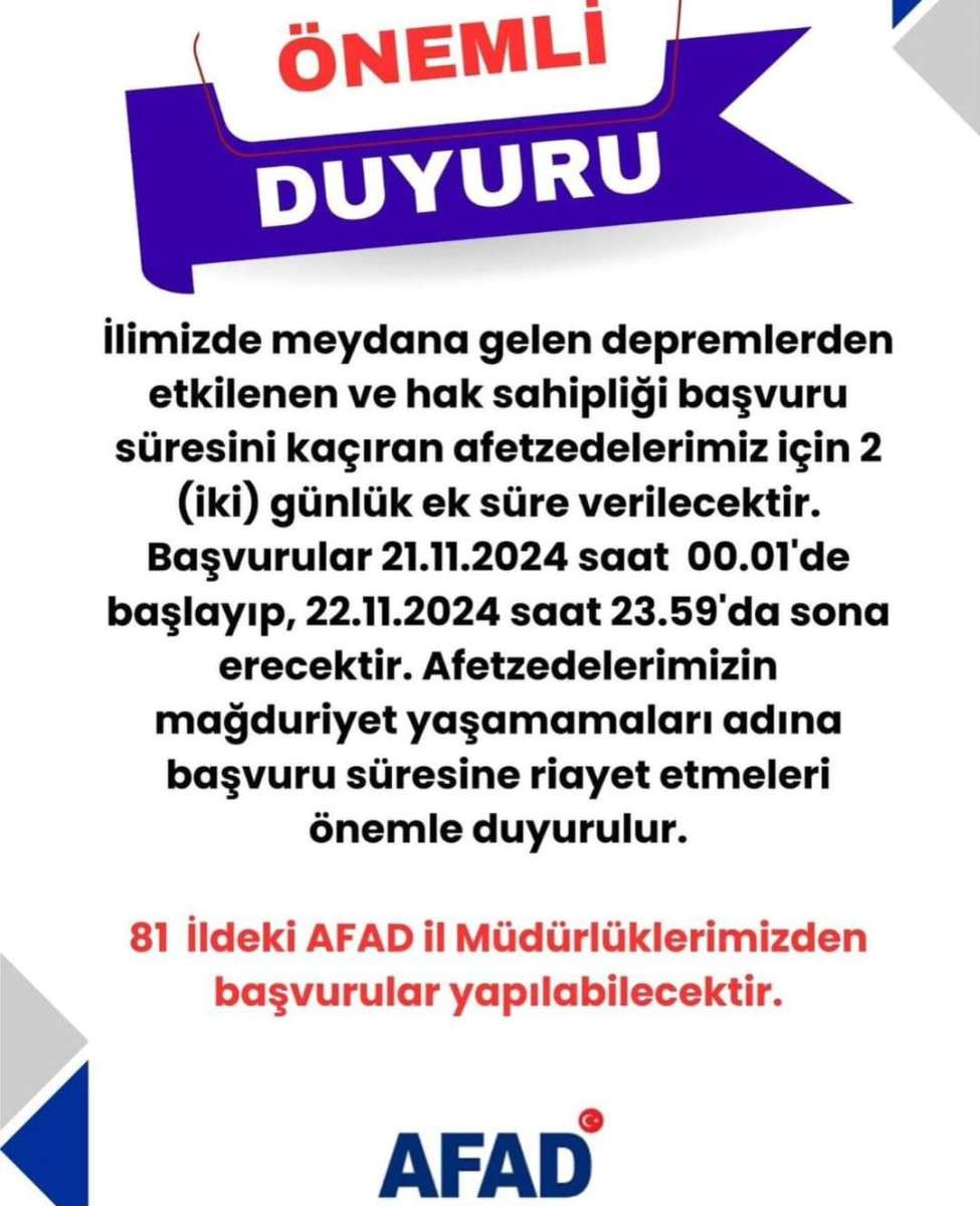 AFAD, ilimizde meydana gelen depremlerden etkilenen ve hak sahipliği başvuru süresini kaçıran afetzedeler için iki günlük ek süre tanındığını açıkladı. Başvurular, 21 Kasım 2024 tarihinde saat 00.01'de başlayacak ve 22 Kasım 2024 saat 23.59'da sona erecek.