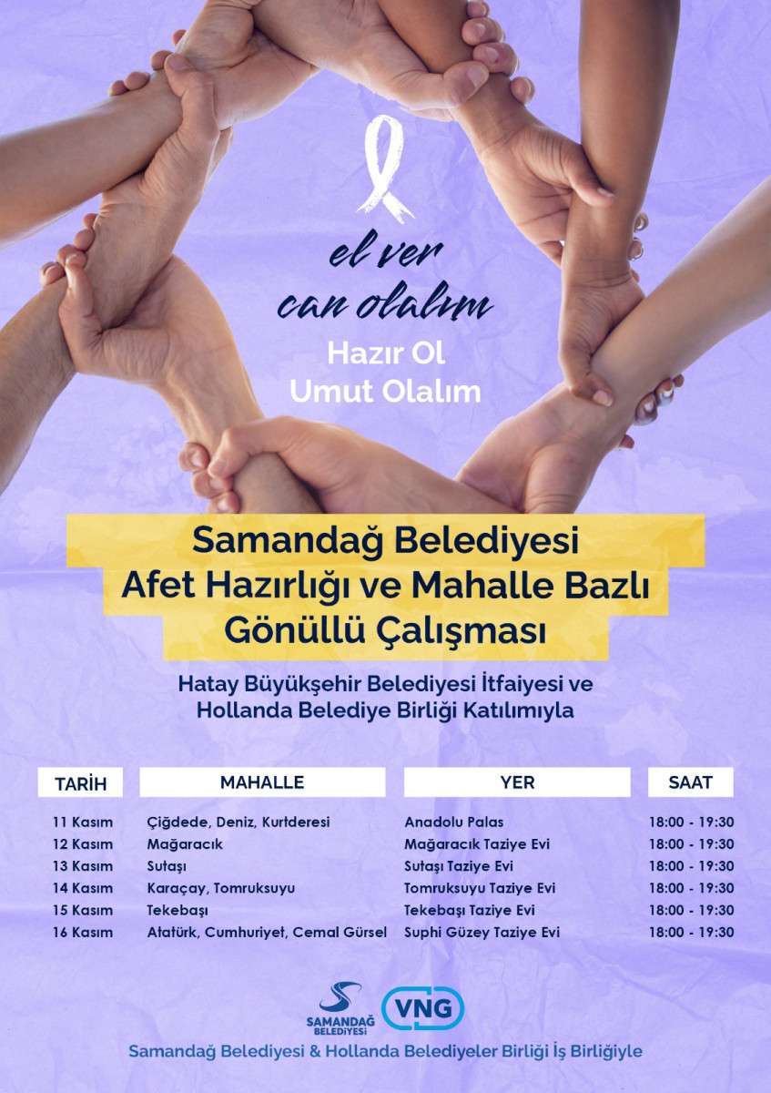 Samandağ Belediyesi, olası afet durumlarına hazırlık amacıyla mahalle bazlı gönüllü çalışmalara başladı. "El ver, can olalım. Hazır ol, umut olalım" sloganıyla yürütülen bu çalışma, Hatay Büyükşehir Belediyesi İtfaiyesi ve Hollanda Belediye Birliği iş birliğiyle gerçekleştiriliyor.
