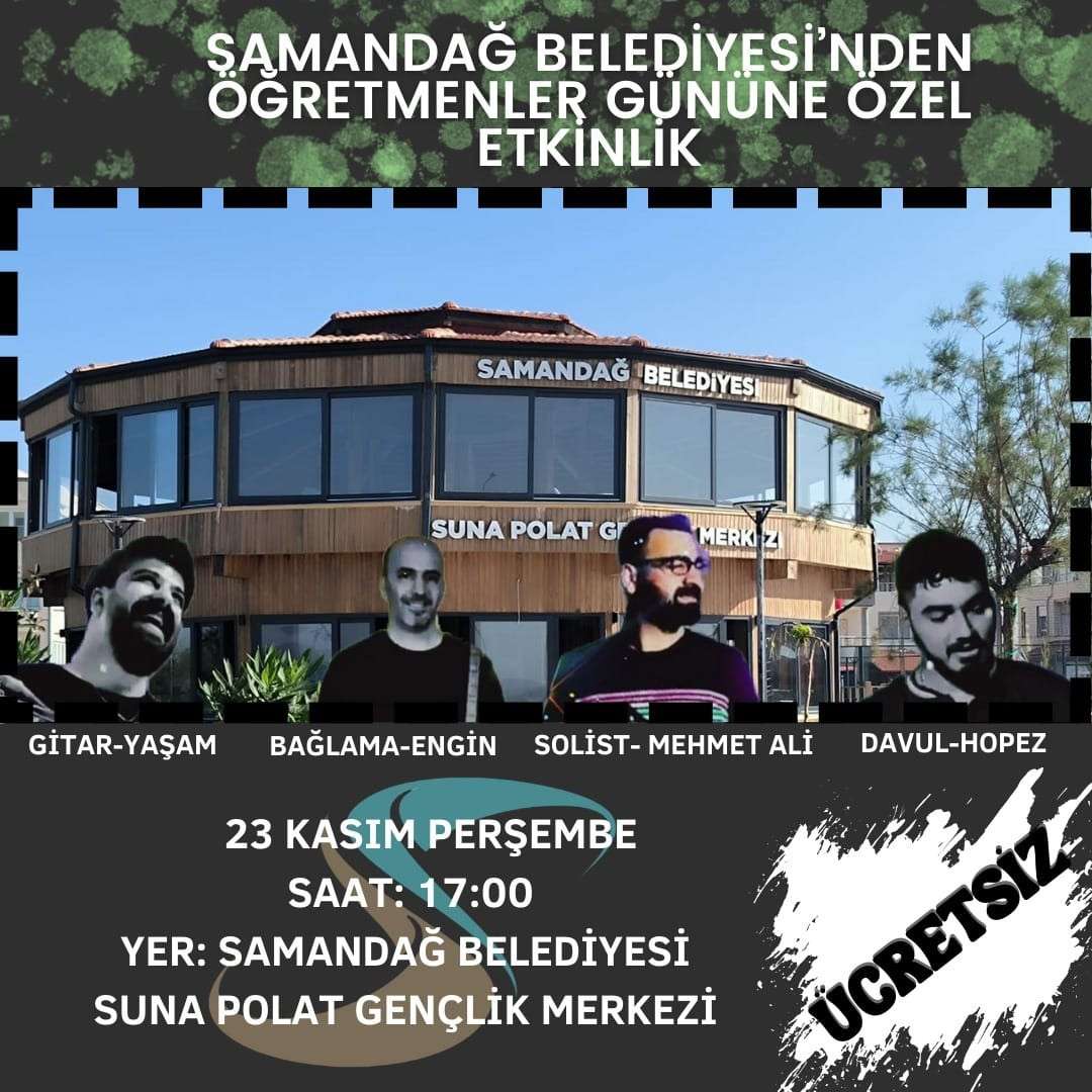 SAMANDAĞ BELEDİYESİ’NDEN ÖĞRETMENLER GÜNÜNE ÖZEL ETKİNLİK Samandağ Belediyesi Öğretmenler günü dolayısıyla Samandağ Belediyesi Suna Polat Gençlik Merkezi’nde eşsiz bir müzik dinletisi gerçekleştirecek. Eğitime verdiği desteklerle sıkça gündeme gelen Samandağ Belediyesi, çok önemli bir görevi ifa eden eğitimciler için de çok anlamlı bir etkinliğe hazırlanıyor. İlçeye yeni eğitim yuvaları kazandırmak için yoğun çaba sarf eden Samandağ Belediye Başkanı Av. Refik Eryılmaz, 23 Kasım Perşembe günü saat: 17:00’de gerçekleştirilecek müzik dinletisine tüm vatandaşları davet etti. Başkan Eryılmaz yaptığı açıklamada; “ Öğretmenlik çok kıymetli ve değerli bir meslektir. Samandağ Belediyesi olarak tüm imkânlarımızı eğitim için seferber ettik. İlçemize çok sayıda eğitim yuvası kazandırdık ve yenilerinin yapılması için de girişimlerimiz devam ediyor. 24 Kasım Öğretmenler Günü dolayısıyla 23 Kasım Perşembe günü Samandağ Belediyesi Suna Polat Gençlik Merkezi'mizde gerçekleştireceğimiz müzik dinletisine tüm halkımız davetlidir. Öğrencilerimizin en iyi şekilde yetişmesi için emek veren tüm öğretmenlerimize şükranlarımı sunuyor, günlerini kutluyorum.” ifadelerine yer verdi.