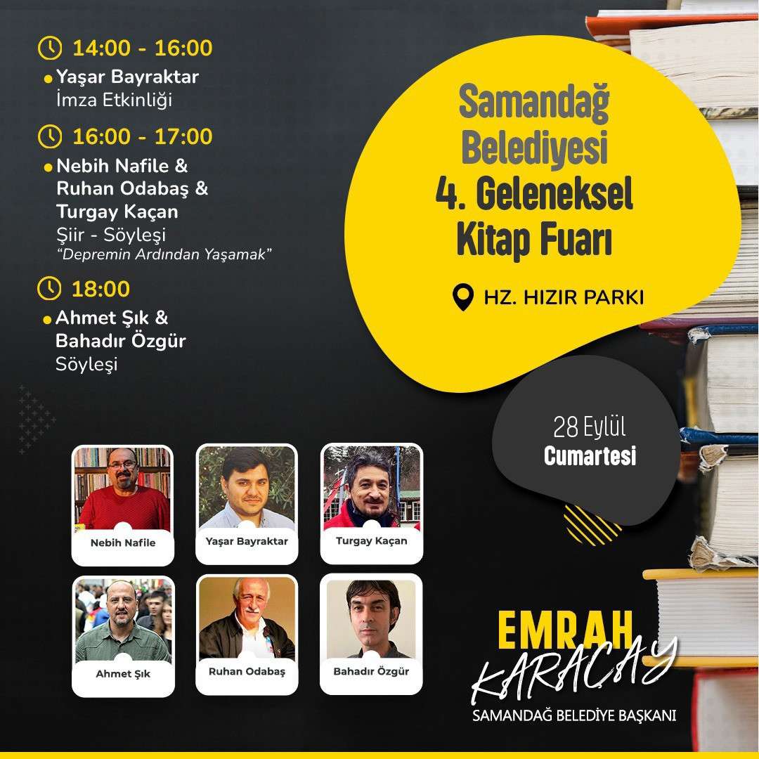 Bütün halkımızı Samandağ Belediyesi 4. Geleneksel Kitap fuarına davetlidir. Tüm halkımızı bekliyoruz.