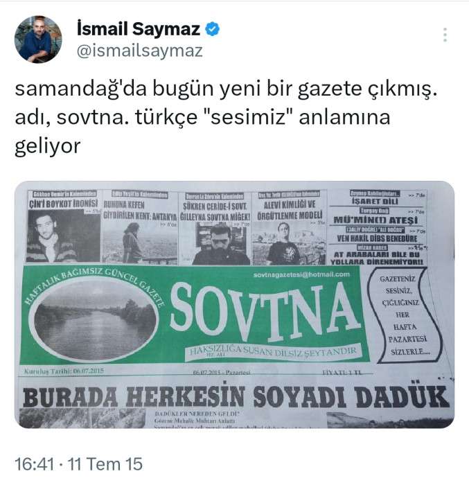 6 Temmuz 2015 yılında ilk baskımızı halkımıza sunduk. Daha ilk baskıda gazete inanılmaz bir ilgiyle karşılandı. İsmi çok dikkat çekmiş ve insanlar büyük bir heyecanla SOVTNA'yı okumak istiyor, ünlü gazeteci İsmail Saymaz bile daha ilk sayıda gazetemizin fotoğrafını çekip Twitter sayfasında paylaşmıştı. Bu ilgiyi gördükten sonra bende iyiki SOVTNA olmuş dedim.