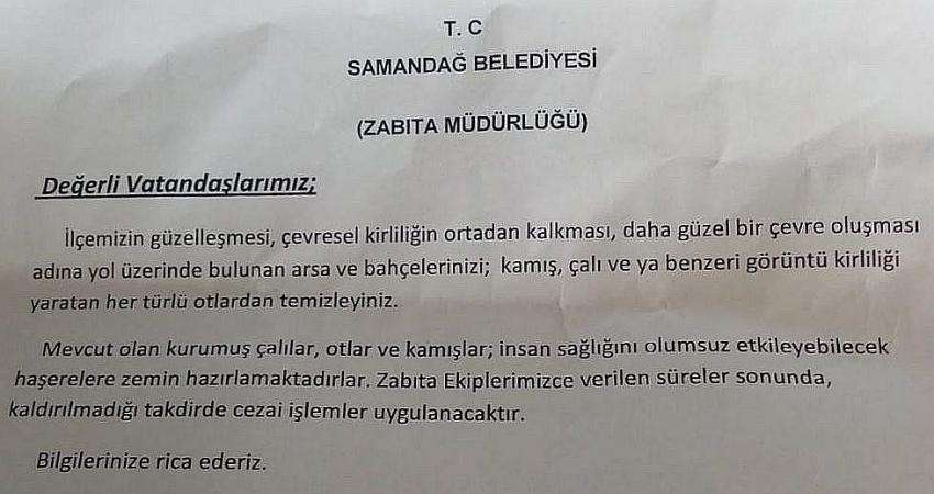 Mevcut olan kurumuş çalılar, otlar ve kamışlar; insan sağlığını olumsuz etkileyebilecek haşerelere zemin hazırlamaktadırlar. Zabıta ekiplerimizce verilen süreler sonunda, kaldırılmadığı taktirde cezai işlemler uygulanacaktır.